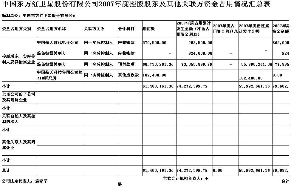 關(guān)于中國東方紅衛(wèi)星股份有限公司2007年度控股股東及其他關(guān)聯(lián)方